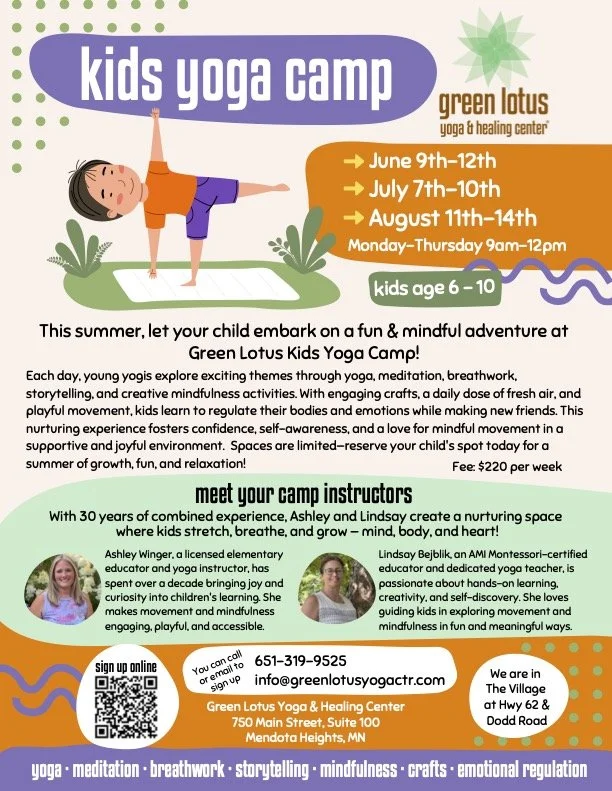Each day, young yogis explore exciting themes through yoga, meditation, breathwork, storytelling, and creative mindfulness activities. With engaging crafts, a daily dose of fresh air, and playful movement, kids learn to regulate their bodies and emotions while making new friends. This nurturing experience fosters confidence, self-awareness, and a love for mindful movement in a supportive and joyful environment. Spaces are limited—reserve your child's spot today for a summer of growth, fun, and relaxation!